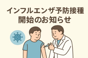 2025年11月1日より、今季のインフルエンザ予防接種と新型コロナワクチン予防接種の受付をを開始いたしました。ご希望の方は、お電話または受付にてご予約ください。ワクチンの在庫に限りがございますので、お早めのご予約をおすすめいたします。